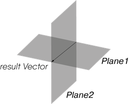 Данный метод создает вектор, полученный пересечением двух заданных плоскостей Plane1 и Plane2. Вектор равен векторному произведению нормалей плоскостей Plane1 и Plane2. Плоскости Plane1 и Plane2 не должны быть параллельны.