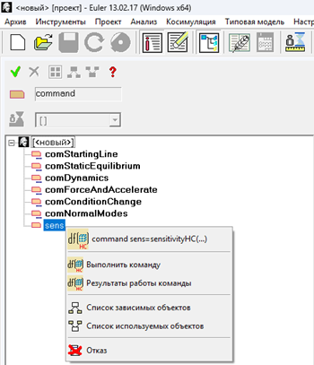 Для выполнения команды в режиме исследования проекта выберите требуемую команду в справочнике проекта, нажмите на нее ПКМ и нажмите на кнопку Выполнить команду (рис. 17).