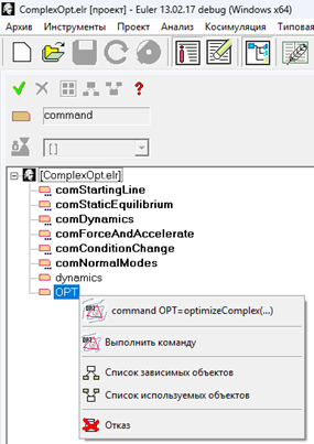 Также для выполнения команды можно выбрать в меню Анализ пункт Комплексная оптимизация с ограничениями /Список команд. В полученном списке команд необходимо выбрать требуемую команду и нажать кнопку Выполнить (рис. 16).