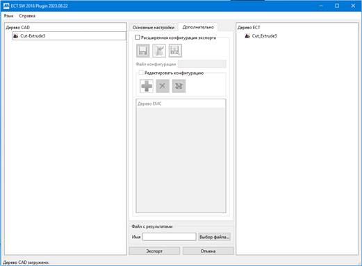 На вкладке «Дополнительно» расположен флажок «Расширенная конфигурация экспорта», который управляет методом экспорта, и инструменты для задания расширенных настроек экспорта, которые могут быть сохранены в EMC-файл, окно показано на рис. 6.
